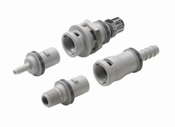 The NS2 meets the need for smaller, more cost-effective industrial couplings. The smaller couplings can replace larger ones, offering users a low-cost, space-saving option for a wide variety of coupling applications. The new couplings also offer very low air inclusion — air induced into the coupling upon connection — minimizing contaminants and reducing the need to purge fluid lines. NS2 Series couplings offer hose barb terminations and are available for tubing in 1/8 in. (3.2 mm) and 1/4 in. (6.4 mm) ID. The ferruless compression terminations connect to 1/4-in. OD (6.4-mm) and 0.17-in. ID (4.3-mm) semi-rigid tubing. Pressure ranges from vacuum to 45 psi (3.1 bar), and operating temperatures range from 32°F (0°C) to 120°F (49°C).