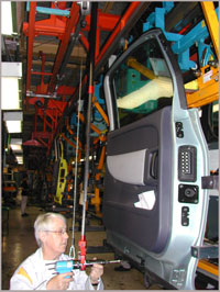 An auto plant selected a new EZ-Glider Telescoping torque arm model for its door assembly. Using a pistol-style air tool, with a torque setting of 12 Nm, the operator fastens a TORX 30 screw.