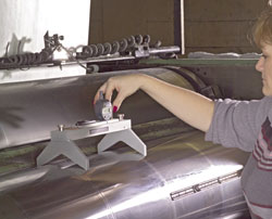 The Roll Adjuster is easy to set up and is simply placed onto the top of a master roller, drive shaft, or idler, and is held in place by a pair of V-legs or adaptable mounts. A fine adjustment screw is turned until the precision bubble level is centered in its glass vial. Pressing a small button on the front to capture the digital position of this first roll or shaft then zeros the digital micrometer. The Roll Adjuster is then placed on top of the next available roller and the fine adjustment screw turned until the bubble level is centered. The vertical alignment of this second roller is shown digitally, either in inches or millimeters, allowing for better adjustment or selection of new shims. The Roll Adjuster is then moved to successive rolls for additional measurements and adjustments.