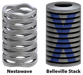 This design is ideal for replacing stacks of Belleville washers, helping to reduce part count, labor, and installation errors. In one application, Smalley engineers helped a customer streamline their design by replacing a stack of 24 Belleville washers with a single Nestawave spring. Pretty impressive! It is available in standard or exotic materials.