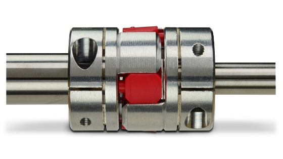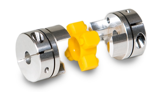 Three-piece assembly: Ruland curved jaw coupling with flexible spider insert.