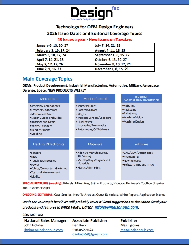 EDITORIAL COVERAGE AND GUIDELINES NEW PRODUCTS: Electrical/Electronic, Mechanical, Motion Control, Software, Materials, Additive Manufacturing, Automation, and more SPECIAL FEATURES: Wheels, Mike Likes, 5-Star Products, Videos+ (video link), Engineer's Toolbox: inquire about Sponsorship! OTHER ONGOING EDITORIAL: Case Studies, Guest Editorials, How-To Articles, White Papers, Design Essentials Download our 2026 Editorial Dates and Coverage as a PDF HERE. Contact Mike Foley (mfoley@nelsonpub.com), Editor, with any editorial questions or to submit a product or contributed article. RATES and SPECS Text Banner Ad Headline: 50-75 words of text, optional .gif or .jpeg static photo or logo (150 x 150 pixels), up to 3 Web links. Top position: $2,150 per issue (net) Other positions: $1,625 per issue (net) Video+ Ad: Your video, linked to your site, premium position, with full contact leads of subscribers who visit. $550 per issue (net) Big Box Ad: Large display ad (300 x 250 pixels) great for branding and sales leads. $825 per issue (net) NEW! Sponsored Advertorial: Contact John or Dan for specs and rates. Custom eBlast: Create your own branded HTML document, and we will blast it to our audience. Contact John or Dan for specs and rates. EDITORIAL SPECS AND GUIDELINES FOR EBLASTS: Advertisers and Editorial Content Providers would be well served to check out our specs, guidelines, and tips for optimizing eBlast content for the Designfax OEM Design Engineer audience HERE. See a SAMPLE DESIGNFAX ISSUE AT: www.designfax.net Designfax is part of Nelson Publishing, which will celebrate its 65th anniversary in 2026 as an essential source of business-to-business information. Have questions? Want to know who to contact about special deals or advertiser testimonials? John W. Holmes, National Sales Manager Dan Beck, Associate Publisher Meg Tjapkes, Publisher |